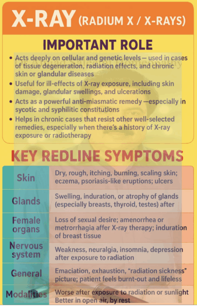 Les rayons X … à la propriété de stimuler le métabolisme cellulaire. Suscite la vitalité mentalement et physiquement. Fait remonter à la surface des symptômes supprimés, notamment sycotiques et ceux dus à des infections chroniques. Son action homéopathique est donc centrifuge, vers la périphérie.