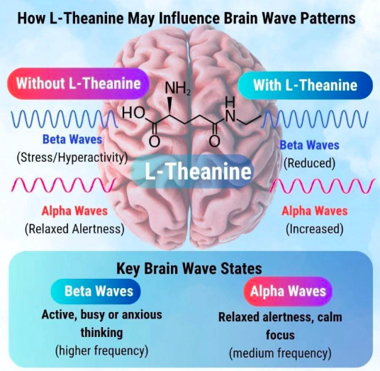 – La L-théanine, en modulant les récepteurs glutamatergiques et en augmentant l’activité des ondes alpha, induit un état d’éveil calme. Les études animales suggèrent aussi une influence indirecte sur le GABA, la dopamine et la sérotonine.