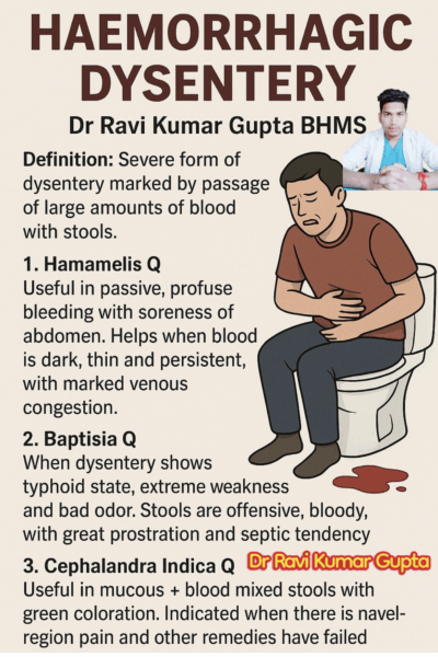 Glycyrrhiza glabra 1DH (anti-inflammatoire et antalgique digestif). A ce stade pathologique, le BNS est indispensable, les plantes proposées les plus efficaces sont : Euphorbium (hg), Scrofularia nodosa (si), Croton tiglium … dont les pathogénésies évoquent la RCH