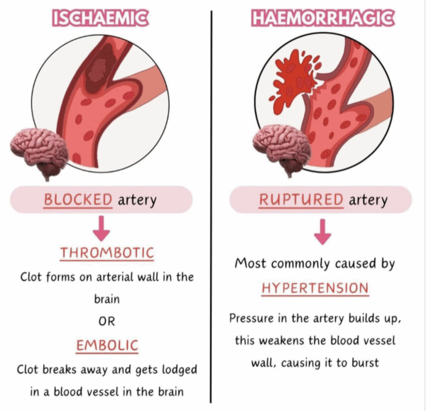 L’interruption du flux sanguin, ou l’accumulation de sang lors d’accidents hémorragiques, provoque la destruction par asphyxie des cellules nerveuses (ou neurones) dans la région concernée. Les conséquences de l’AVC varient selon la zone du cerveau touchée et l’ampleur des lésions. Environ 85 % des AVC sont d’origine ischémique et 15 % d’origine hémorragique. On parle volontiers d’ICTUS BLANC et d’ICTUS ROUGE. Cette maladie touche autant les hommes que les femmes et 75 % des personnes atteintes ont plus de 65 ans.