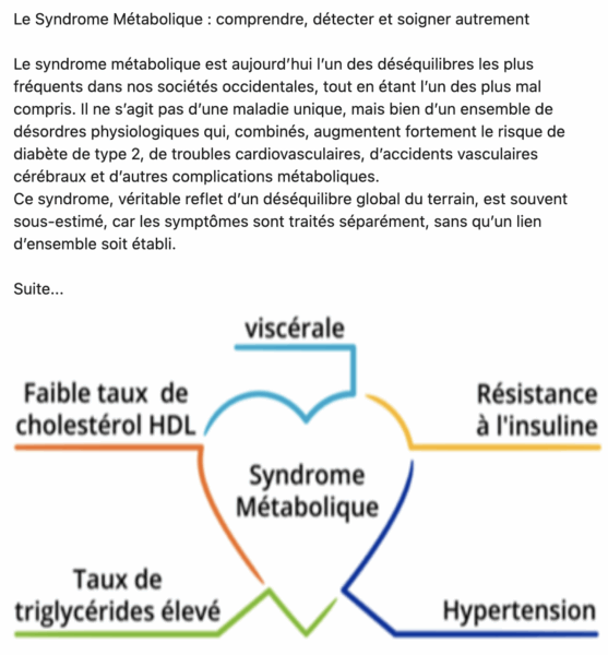 Les aliments sont en cause sont : les SUCRES (donc les alcools et les farineux) qui devront être supprimés (périodes de cétose – si pas de contre-indication) ou pesées (phases de « régime diabétique ») et les GRAISSES ANIMALES (acides gras saturés, très caloriques) qui devront être réduites et remplacées (en partie) par des acides gras poly insaturés (première pression à froid). Le meilleur traitement du SM est donc le changement de l’hygiène de vie et des habitudes alimentaires !