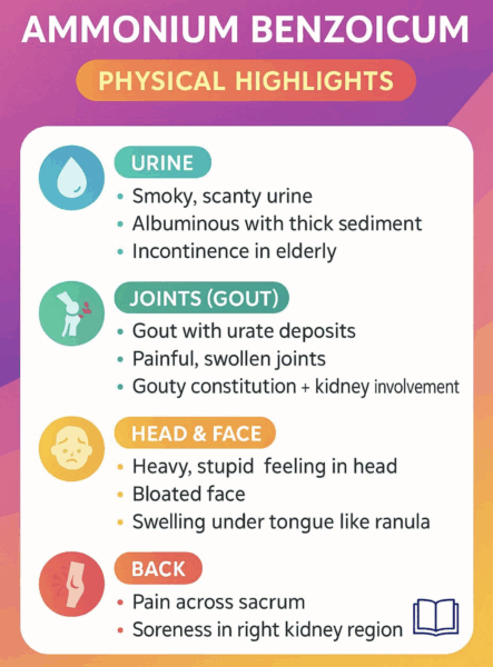 Ammonium benzoïcum (Kollitsch p. 286). Proche d’Ammonium carb. Insuffisance rénale avec crises de goutte.