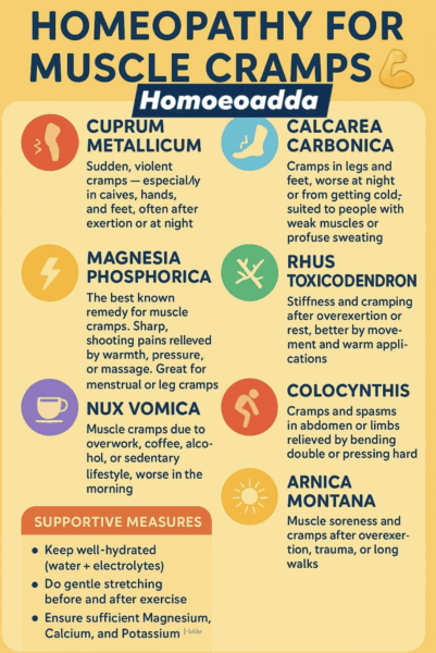 Elles sont favorisées par divers situations : la grossesse, la fatigue, l’activité sportive (natation surtout), la déshydratation (« vide d’eau », sujets par exemple : Alumina ou Causticum), le froid (essayez les applications chaudes) ou encore des positions imposant le raccourcissement musculaire.