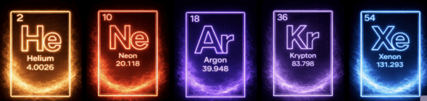 Sur le tableau de Mendeleïev, les gaz rares apparaissent à la dernière colonne marquée VIII B. En tête, L’HELIUM avec une masse atomique de 4, puis dans l’ordre LE NEON, L’ARGON, LE KRYPTON, LE XENON et LE RADON avec respectivement des masses de 20, 40, 84, 131, et 222.