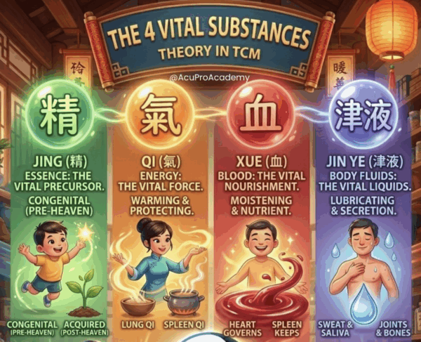 En médecine chinoise, il est dit que le corps humain est intrinsèquement composé de 5 substances de base. Ces substances sont réellement fondamentales : si l’une d’elle vient à être en déséquilibre, alors le corps humain de sera pas en harmonie. Ces substances fondamentales sont :