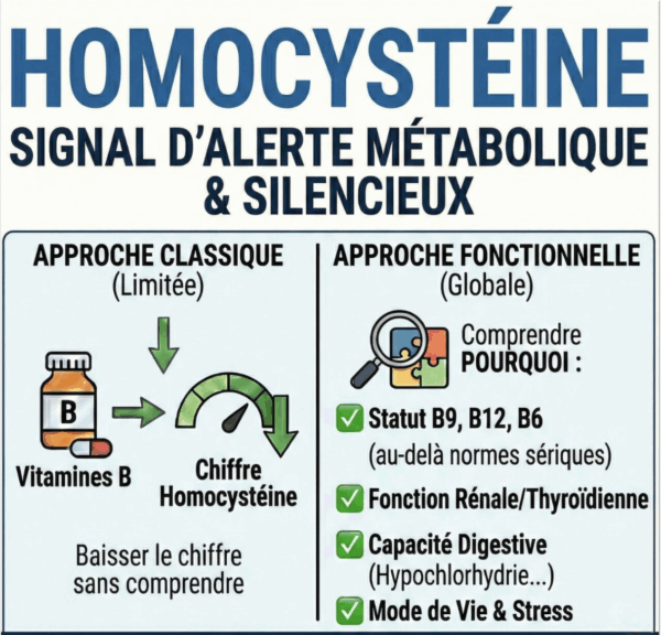 En plus de son lien avec la santé cardiovasculaire, l’homocystéine est associée au vieillissement, aux maladies neurodégénératives comme Alzheimer et à des troubles dépressifs. Dans une approche de médecine fonctionnelle, mesurer l’homocystéine permet d’évaluer le métabolisme global et la détoxification de l’organisme.