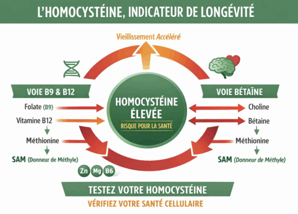 Un taux élevé d’homocystéine (hyperhomocystéinémie) accroît significativement les risques cardiovasculaires, en favorisant la formation de caillots sanguins et l’oxydation des LDL. Chaque augmentation de 5 µmol/L peut accroître le risque d’infarctus de 60 % chez l’homme et de 80 % chez la femme.