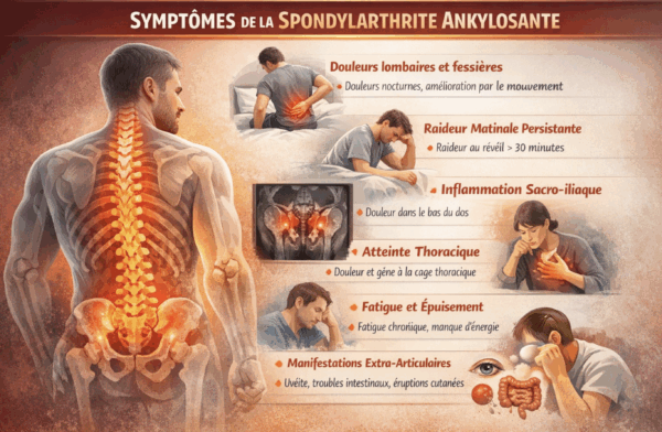 C’est un rhumatisme inflammatoire chronique (sans facteur rhumatoïde) frappant plus particulièrement le pelvis (les articulations sacro-iliaques) et le rachis (dorso-lombalgies et/ou douleur fessière). La douleur survient la nuit et réveille au petit matin. Bouger et marcher la soulage contrairement aux douleurs liées à un lumbago ou un torticolis. Le lever est douloureux, à cause d’un « dérouillage » qui peut durer plus d’un quart d’heure.