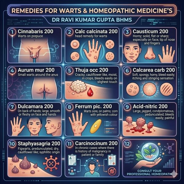 Lors de l’utilisation de l’homéopathie pour les verrues, de meilleurs résultats sont obtenus lorsque le remède correspond aux caractéristiques de la personne, ainsi qu’à la forme et à l’apparence de la verrue. Dans cet esprit, quelquesd remèdes sont prescrits plus souvent que tout autre –