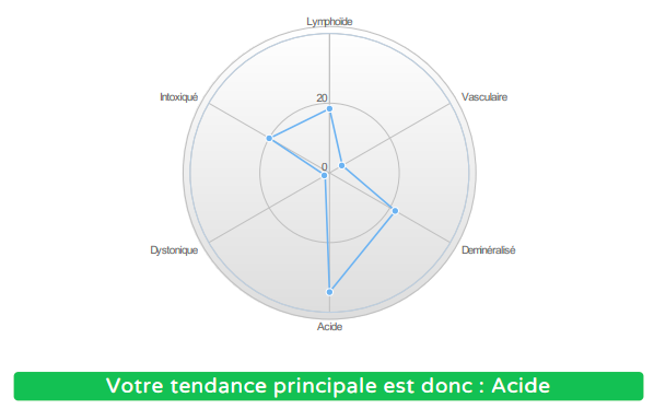 La tendance générale est présenté en première page, sur le « camembert des régulations » qui pointe la tendance de votre terrain vis à vis des différentes façons de vieillir (intoxiqué, dystonique … etc). Il s’agit de 6 vecteurs que l’on organise selon deux axes (inflammation/sclérose et humidité sécheresse). Le plus long indique la fragilité qui domine.